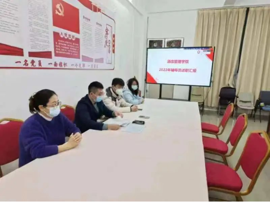 为加强我院学工队伍建设,全面、准确地评价辅导员的工作表现和工作业绩,激励和促进辅导员不断增强工作技能、提高育人水平,酒店管理学院于12月16日下午16:30,通过线上线下相结合的方式,在创新楼创实301召开了辅导员述职报告会。学生处张凌霄、丘瑞晨老师,酒店管理学院全体学工老师参加了述职报告会,会议由我院学工负责人兼党支部书记谢锦权主持。