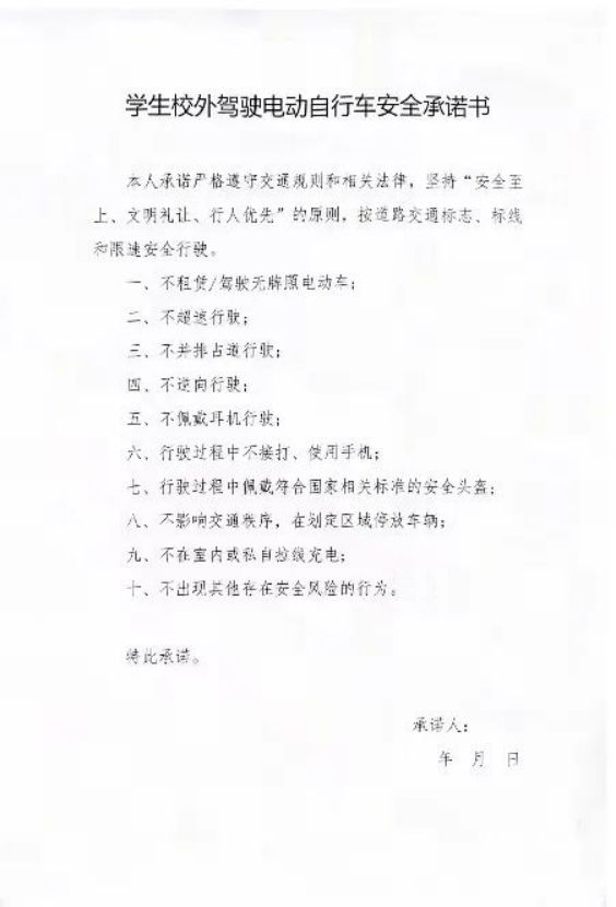 最后,每个同学都签署了校外驾驶电动车安全承诺书,坚持“安全之上,文明礼让,行人优先”的原则。