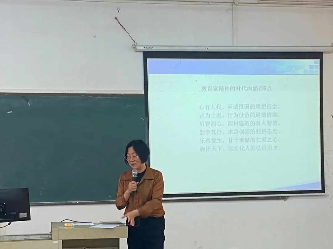 接着,林院长从以下六个方面给全体教师们讲解了教育家精神的时代内涵。分别为:心有大我、至诚报国的理想信念;言为士则、行为世范的道德情操;启智润心、因材施教的育人智慧;勤学笃行、求是创新的躬耕态度;乐教爱生、甘于奉献的仁爱之心;胸怀天下、以文化人的弘道追求。林院长告诉我们:教育家精神是无数教育家在实践中积累的宝贵财富,扎根教学一线、深耕教育实践是成长为教育家的必经之路,其成长过程具有鲜明的实践特征,我们广大教师要成为“行动派”,做有研究能力的实践者,不断提高自身能力与素质,以追求卓越的思维自觉实现自身专业发展,努力做到个人价值和社会价值相统一。