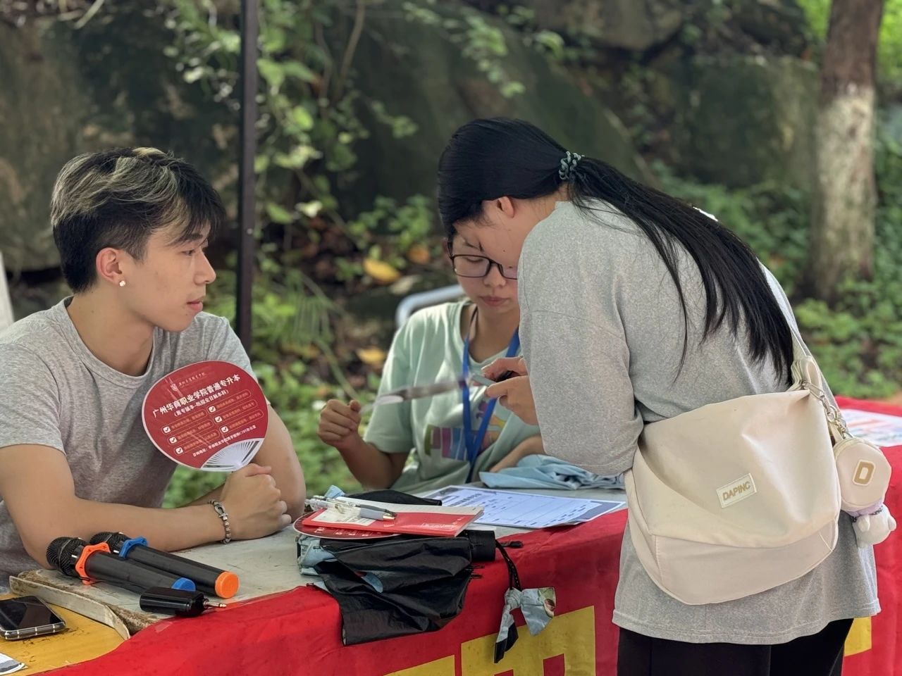 在摆摊过程中,学生会工作人员为同学们介绍学生会的相关事宜,耐心地为同学们解惑答疑,号召同学们踊跃报名。同时引导同学们扫码进群,以便同学们更好地咨询到相关信息。