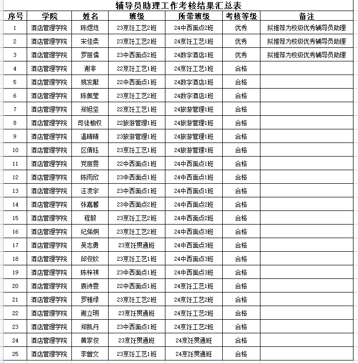 在学院领导和辅导员的悉心指导下,2024级酒店管理学院新生辅导员助理以服务精神为先导,恪守职责,积极协助辅导员开展各项任务。为了表彰优秀表现,树立典型榜样,依据《广州华商职业学院新生辅导员助理管理办法》的相关规定,并结合我院实际情况,经过学生自主申报、辅导员初审、学院复审等严格程序,拟推荐陈煜垲等3位同学为“广州华商职业学院优秀辅导员助理”,现将考核结果公示如下: