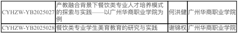 何洪健老师的课题:《产教融合背景下餐饮类专业人才培养模式的探索与实践——以广州华商职业学院为例》,深化校企合作,推动专业建设与产业需求精准对接。谢锦权老师的课题《餐饮类专业学生美育教育的研究与实践》,将美育融入职业教育,提升学生职业素养与审美能力。