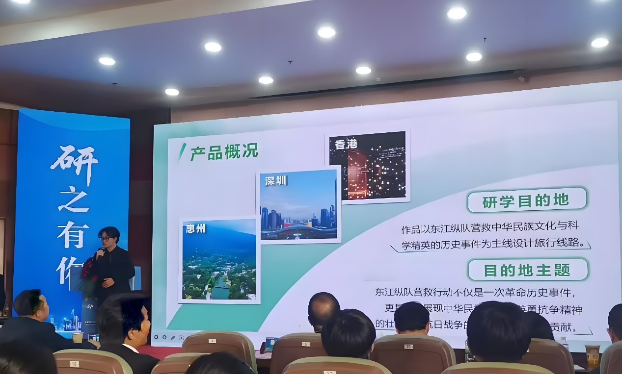 参赛作品《踏寻革命足迹,探索科学奥秘》以东江纵队营救中华民族文化与科学精英的历史事件为主线设计旅行线路,以岭南文化为辅线融入课程内容,巧妙地将教育性与实践性相结合,是一款主题鲜明,研学内容丰富、形式多样、注重实践与体验、跨学科融合,既传承红色基因,又培养科学精神,具有双重教育价的研学旅行产品,给评委和观众留下了深刻印象。