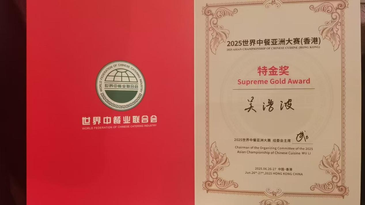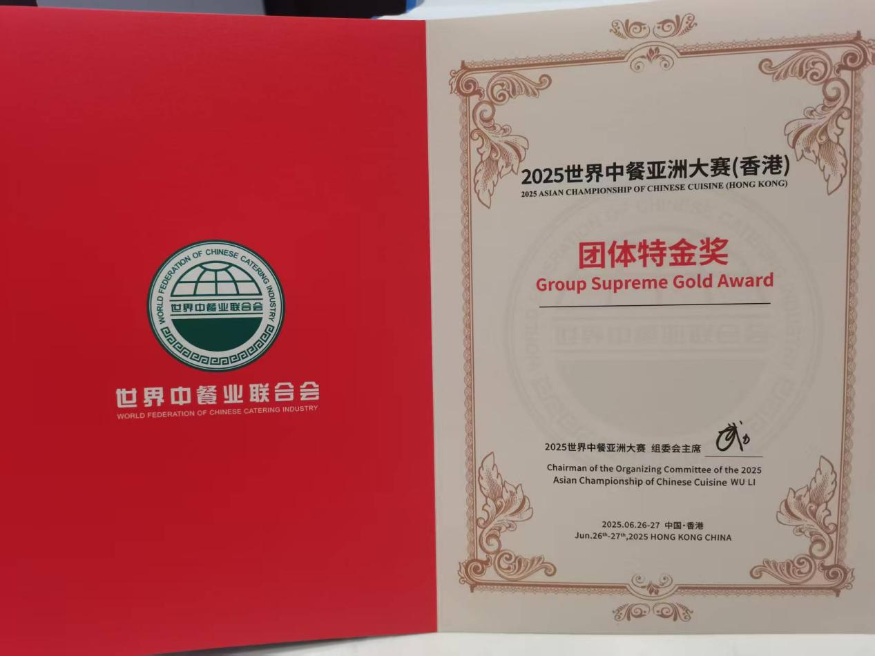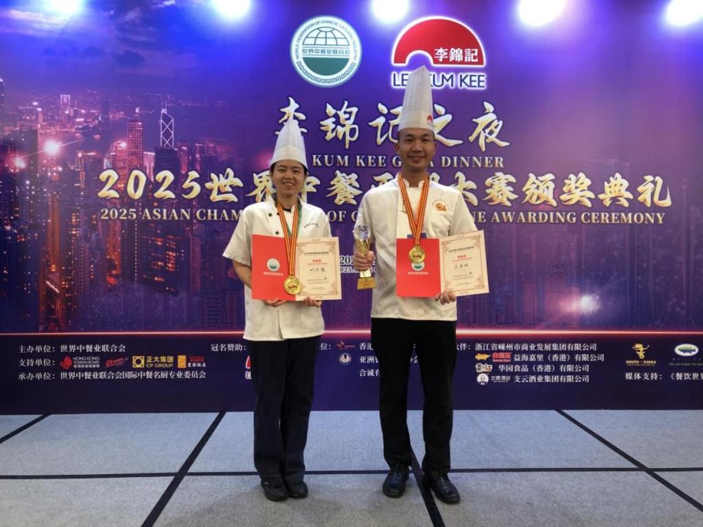 2025年6月26日,由世界中餐业联合会主办的2025世界中餐亚洲大赛在香港中华厨艺学院隆重举行。来自亚洲各地的70支顶尖队伍齐聚“中华名厨堂”,在九国评委团的严格评审下展开激烈角逐。广州华商职业学院酒店管理学院教师吴浩波与刘思蕴凭借匠心技艺与创新融合,以优异成绩勇夺个人特金奖,学校同时荣膺团体特金奖。
