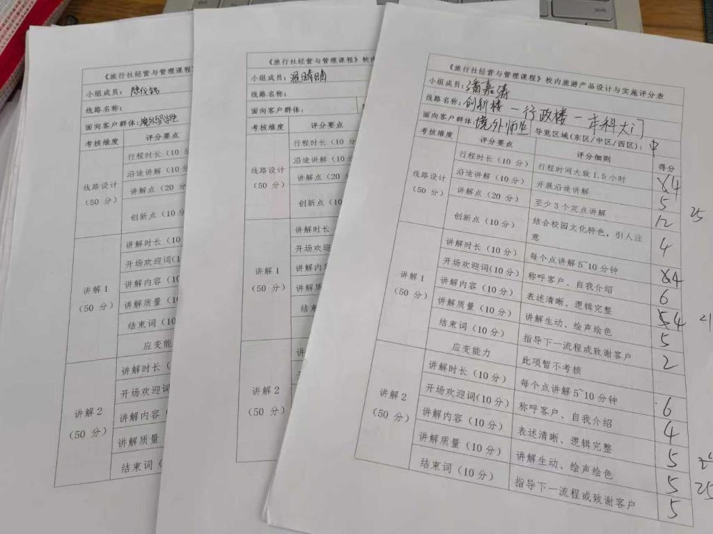 教师评分聚焦专业标准落地,小组互评侧重同伴学习借鉴,既关注线路设计的创新性与资源匹配度,也重视讲解过程的专业性与感染力。同学们在互评中积极交流经验,探讨“如何优化线路串联”“怎样让讲解更具吸引力”等问题,在思维碰撞中深化对课程知识的理解与应用。