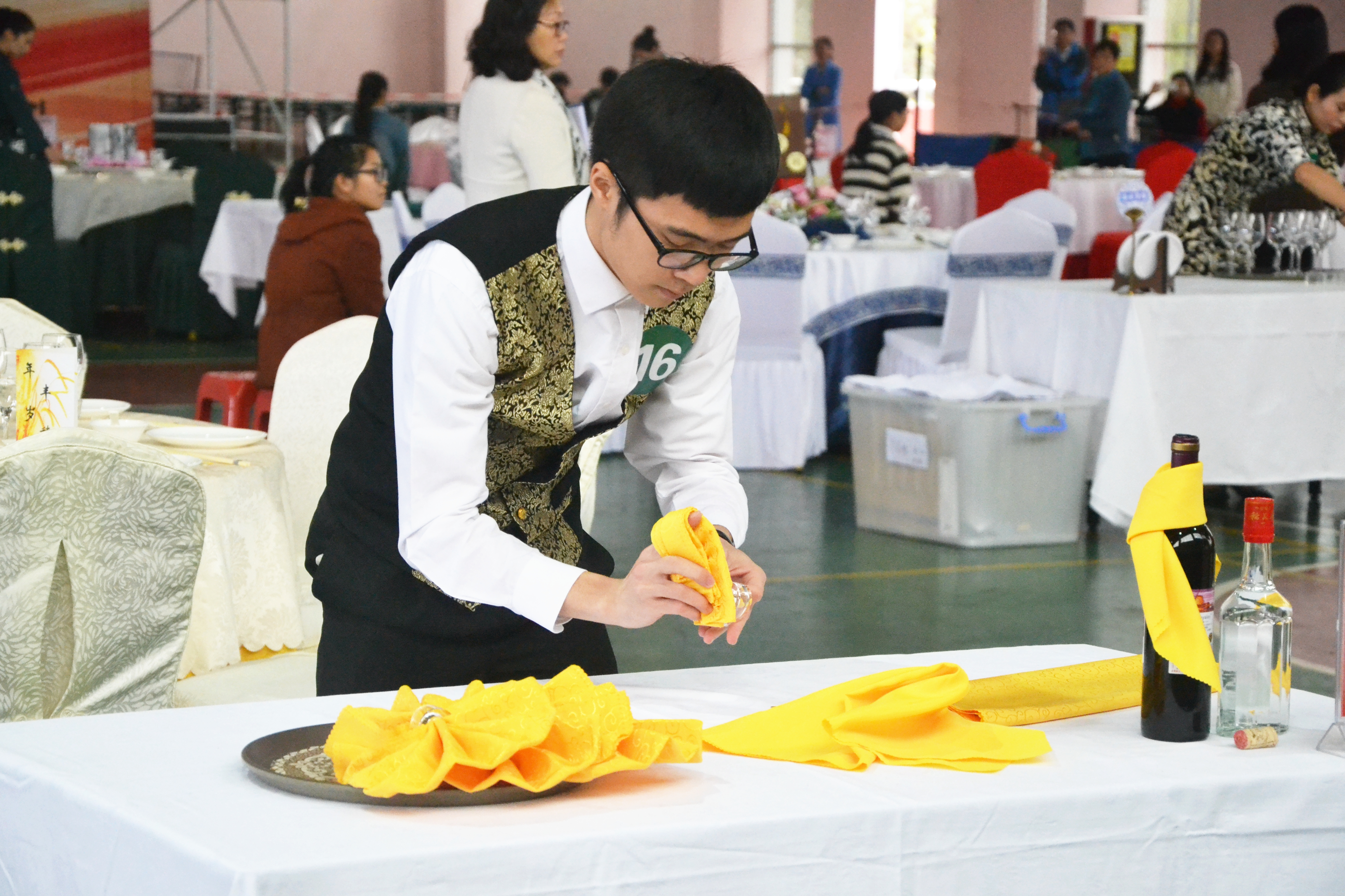 此次比赛共有6个团队进入决赛,每个团队包含3名成员,主要分为四个环节:第一环节是仪容仪表展示;第二环节是宴会方案现场讲解;第三环节是主题方案现场摆台。现场担任评委的老师有鲁峰院长、周期老师、曾瑞老师、方雪老师、江耀辉老师。
