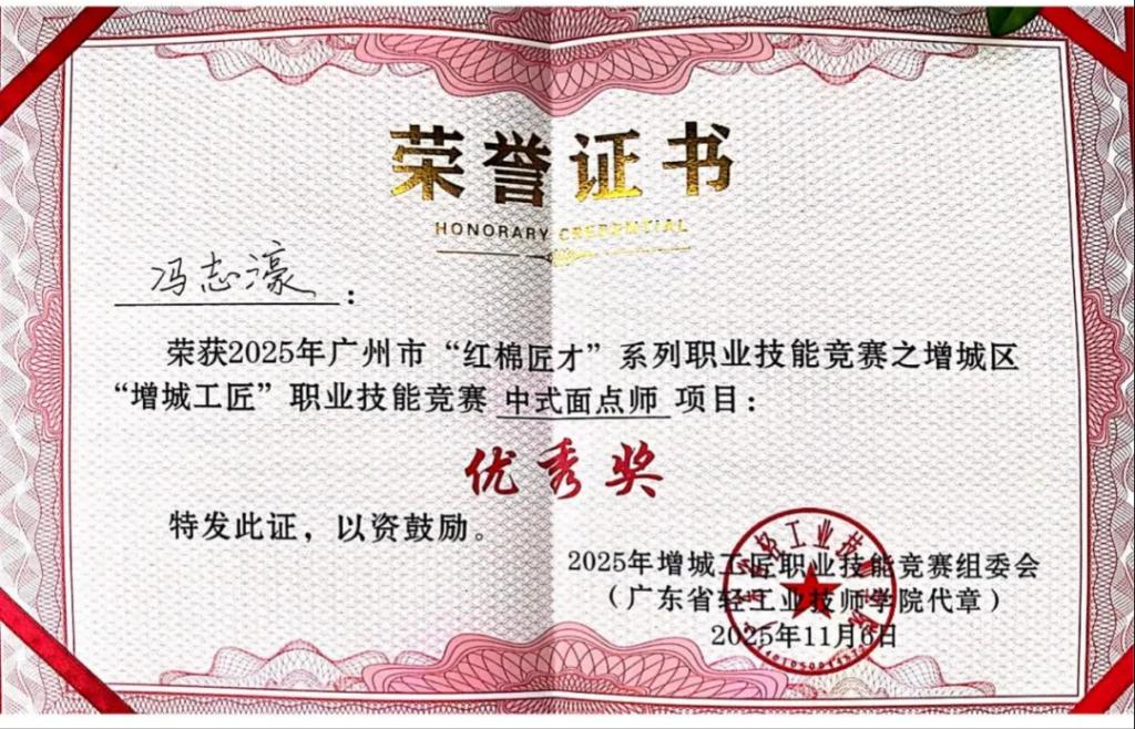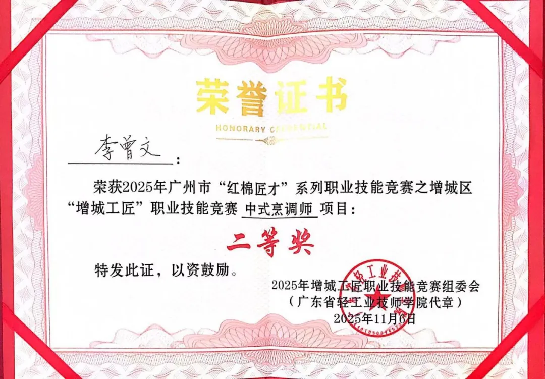 根据竞赛规则,获得优胜奖以上且综合成绩合格的选手,可由广东省轻工业技师学院申报并颁发相应项目的三级(高级)职业技能等级证书。该证书作为国家职业技能等级证书,效力等同于传统职业资格证书,是餐饮行业求职、晋升的权威凭证,在粤港澳大湾区餐饮企业中认可度高,为学生长期职业发展奠定了坚实基础。