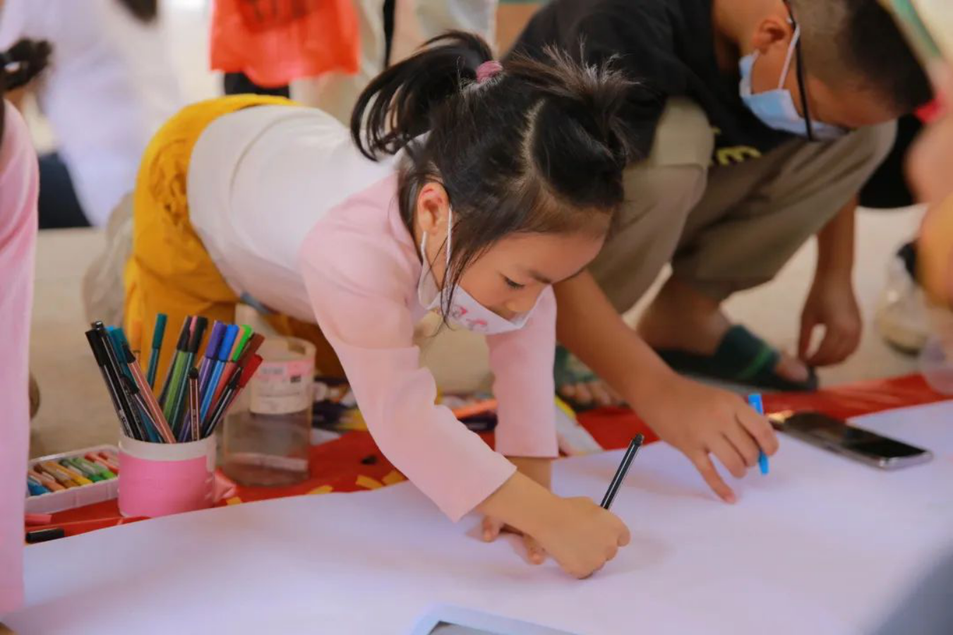 活动第二环节,革命老区塘头村为主线开展绘画活动。长长的画卷一字排开,孩子们大胆构思,自由创新,一张张可爱的小脸上满是投入的神情,他们用稚嫩的画笔、绚丽的色彩描绘着心中的美好画卷,每一根线条都洋溢着孩子们的希望,每一抹色彩都体现着孩子们丰富的童心。在志愿者的共同帮助下,经过一个多小时的创作,一幅色彩斑斓的画面跃然于画布上,孩子们用自己满腔的热情表达了对党和祖国的热爱与祝福。