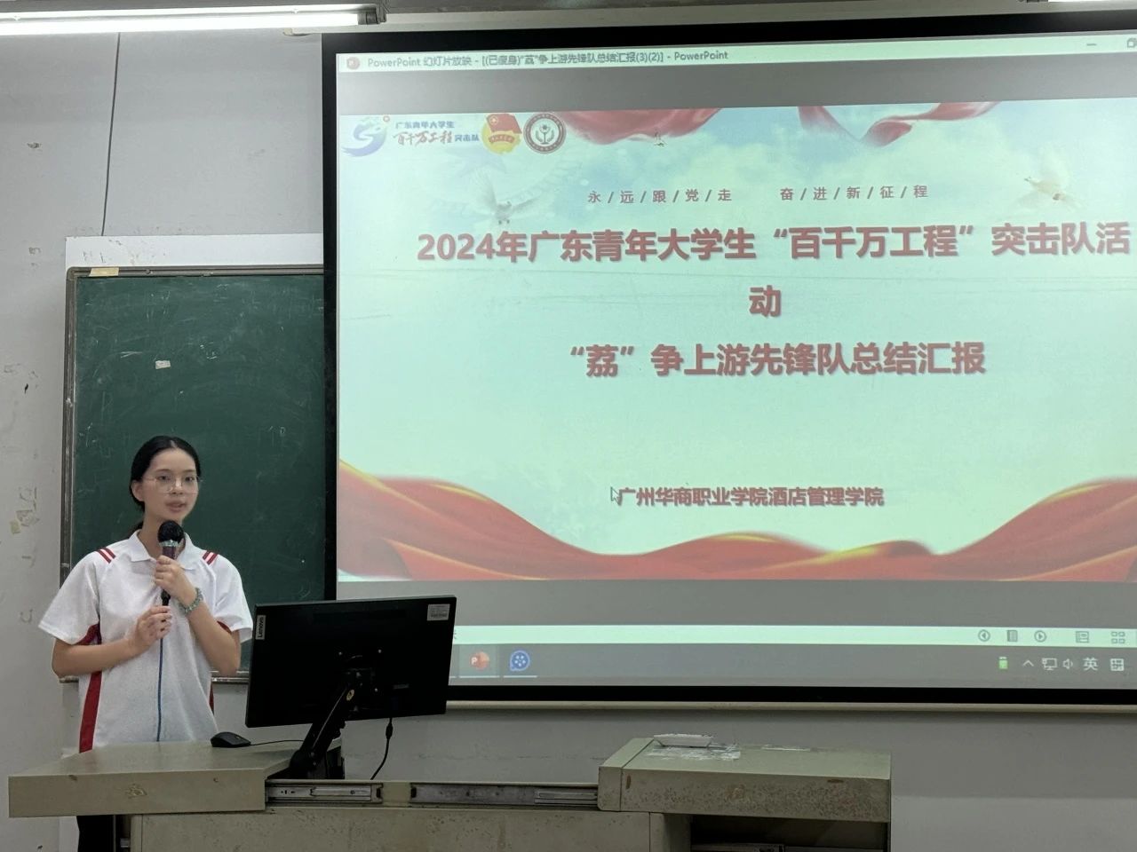 “荔”争上游先锋队的汇报人党丽雯同学在汇报展示中提到,该实践队在8月19日至25日期间,走进新塘镇坭紫村开展了暑期“三下乡”社会实践活动。期间开展了系列实践活动,充分发挥专业优势,传承红色文化,营造良好乡风,讲好坭紫故事,助力乡村振兴。为期一周的下乡实践期间,实践队共发表活动推文5篇、制作短视频2个。其中凝聚师生智慧结晶的坭紫村红色导赏短视频获得了村委领导的高度赞赏。