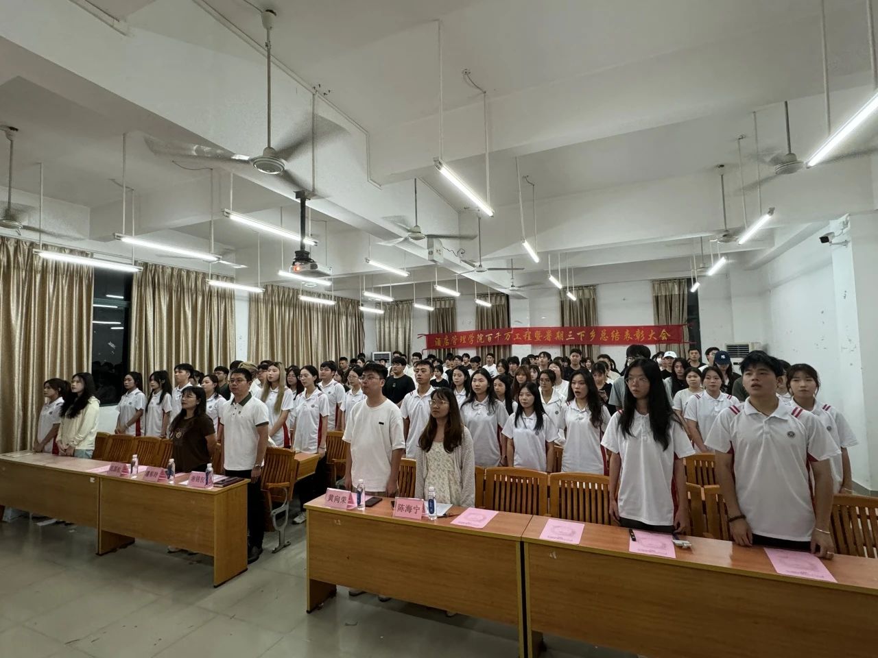 我院2024年“百千万工程”突击队行动暨“三下乡”社会实践活动总结表彰大会在庄严的国歌声中拉开序幕。