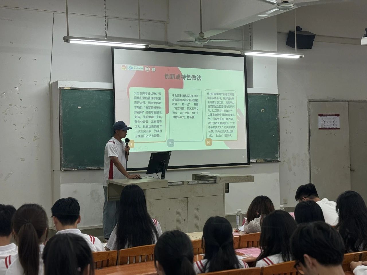 “味”力无限、“粤”煮越旺实践队的汇报人谢非同学在汇报展示中提到,该实践队作为我校重点实践队,在今年暑期7月11日至24日两周里,实践队全体成员师生18人到增城区正果镇正果老街开展了百千万工程突击队行动暨“三下乡”社会实践,受到了地方的欢迎与好评。实践队充分发挥烹饪工艺与营养、面点工艺等专业特色与学科优势,有效完成既定的实践任务,取得了预期的实践成果。为期两周的下乡实践活动也受到了校外各级媒体的关注报道累计17篇,其中包括《光明日报》1篇、《中国教育在线》1篇、《中国青年网》1篇、南方+2篇,“增城青年”公众号1篇、增城融媒体公众号6篇等,累计阅读人数破万,并受到了增城融媒体的现场报道与采访,取得了较好的社会反响。