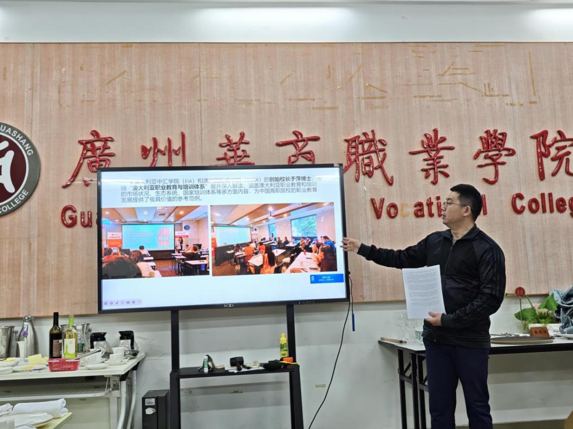 接下来,谢锦权副院长作培训汇报。他提到此次赴澳洲进行培训,学习了解了澳洲的教育教学模式及其先进的教育教学理念,探讨推进职业教育国际化合作的创新路径,并为“粤菜师傅”海外交流及“中餐繁荣基地”项目搭建桥梁。