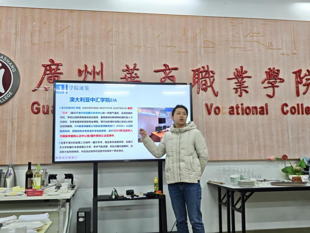 为深入推进内涵建设,全面落实学校“人才强校”战略,进一步拓宽教师国际化视野,加强学习交流与经验分享,2月26日下午,广州华商职业学院酒店管理学院举行了“赴澳优秀管理人员及骨干教师国际化视野培训”项目专题汇报分享会。酒店管理学院全体教师参加会议,我院副院长谢锦权、烹饪工艺与营养专任教师刘思蕴作了培训汇报分享。