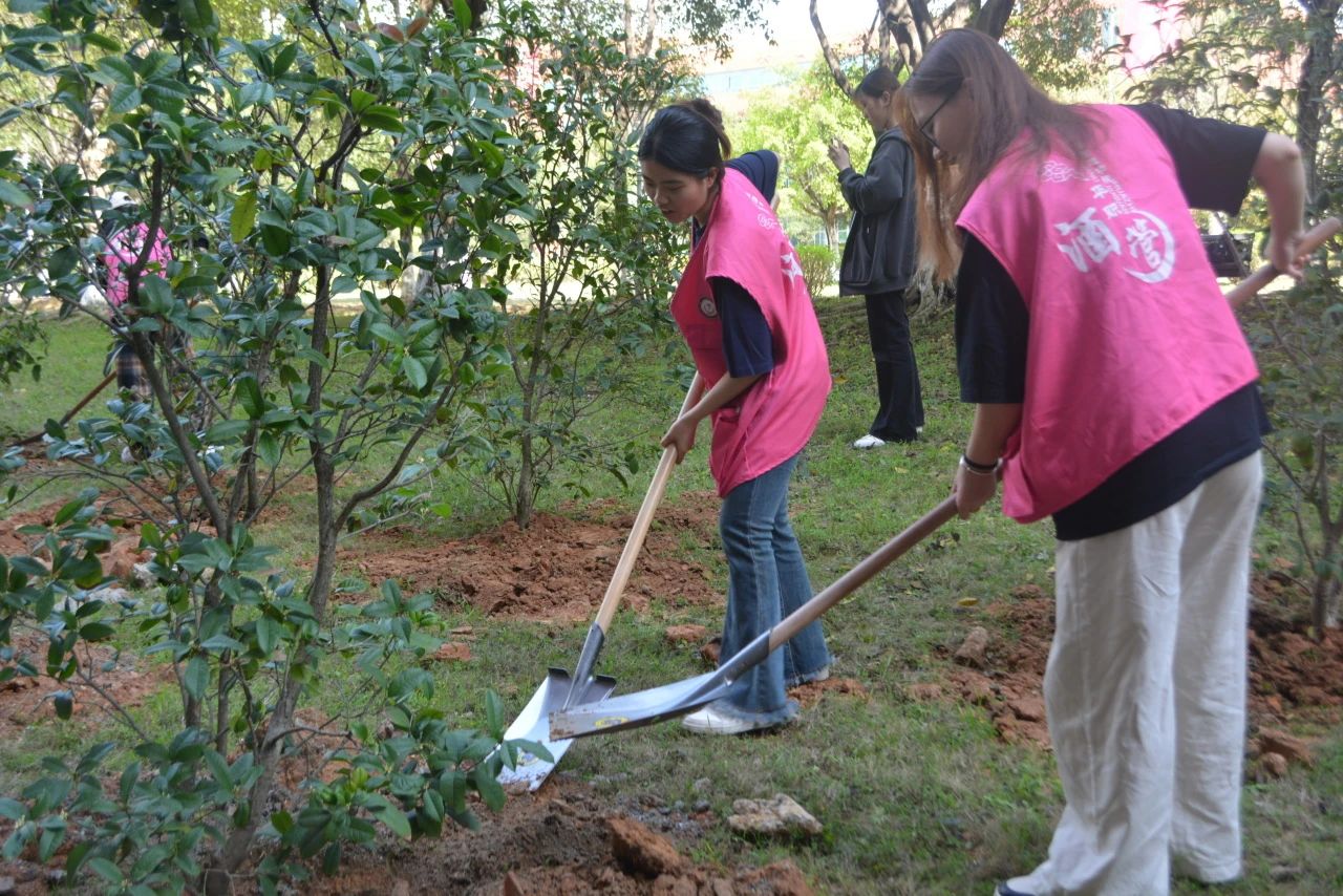 活动当天,同学们提前到位准备。穿着红色小马甲的酒管学子一到现场就迅速分组,挖坑、扶苗、填土、浇水,分工明确、配合默契。大家一边劳动,一边交流环保心得,现场气氛热烈。在齐心协力下,小树扎根校园,为校园添上一抹新绿。