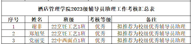 在学院领导和辅导员的悉心指导下,2023级酒店管理学院新生辅导员助理以服务精神为先导,恪守职责,积极协助辅导员开展各项任务。为了表彰优秀表现,树立典型榜样,我们依据《广州华商职业学院新生辅导员助理管理办法》的相关规定,并结合我院实际情况,经过学生自主申报、辅导员初审、学院复审等严格程序,拟推荐谢非等3位同学为“广州华商职业学院优秀辅导员助理”,现将考核结果公示如下: