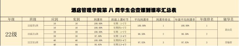 书山有路勤为径,学海无涯苦作舟。以下是酒店管理学院学生会纪检部对我院第八周的学生到课情况汇总结果: