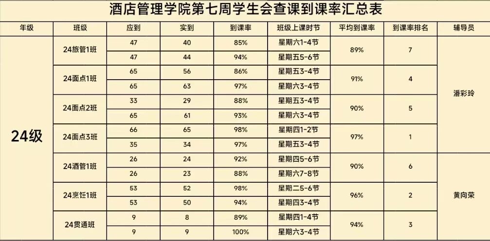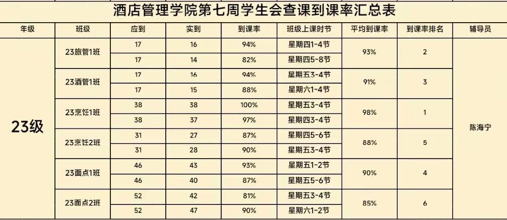 以下是酒店管理学院第七周到课率: