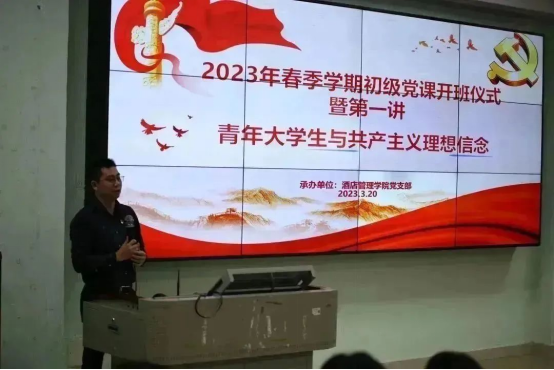 为引导广大学生深入学习贯彻习近平新时代中国特色社会主义思想和党的二十大精神,切实加强青年大学生的思想理论水平和政治素养,端正入党动机,引导大学生树立正确的人生观、世界观、价值观,酒店管理学院党支部于3月20日中午在博C101举行了2023年春季学期初级党课开班仪式暨第一讲。酒店管理学院党支部书记谢锦权、党支部组织委员黄向荣、院团委副书记陈海宁、实习辅导员谢香德、张琳燕出席活动;来自酒店管理学院、国际经济与贸易学院、智能工程学院、工商管理学院、教育与艺术学院以及机关党总支近200名师生学员参加了培训。初级党课第一讲由酒店管理学院党支部书记谢锦权主讲。