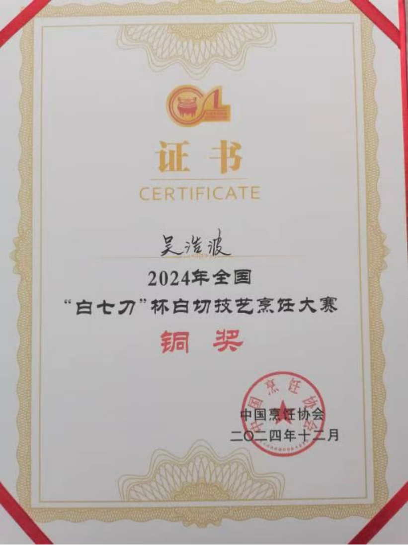 2024年12月,吴浩波荣获全国“白七刀”杯白切技艺烹饪大赛铜奖。
