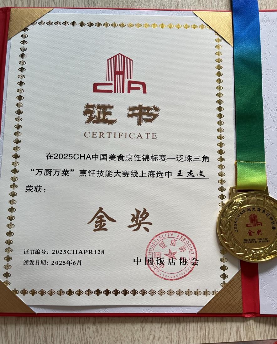 2025年5月17日,广州华商职业学院酒店管理学院附属教学酒店·太阳城大酒店的西式烹饪教师王杰文凭借精湛的技艺和出色的创新能力,在西餐组中脱颖而出,一举斩获金奖,为学院和酒店赢得了极高的荣誉。