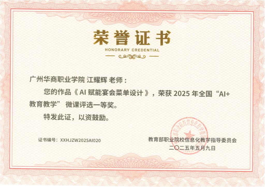 2025年5月9日,AI微课《AI赋能宴会菜单设计》:探索科技与文化融合的教学模式该课程以广州国际美食节“花城锦绣”主题宴会为案例,深入讲解AI技术在现代餐饮菜单设计中的应用。获得教育部职业院校信息化教学指导委员会“AI+教育教学”微课评选一等奖。