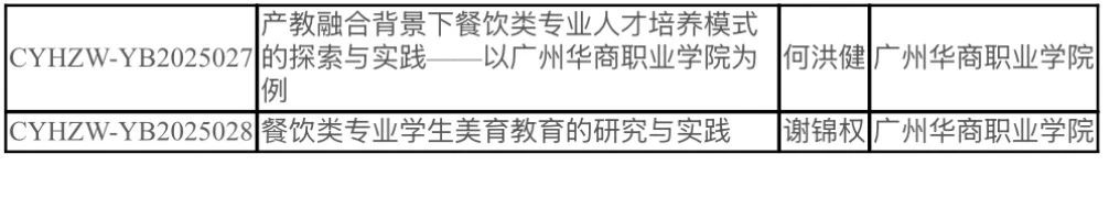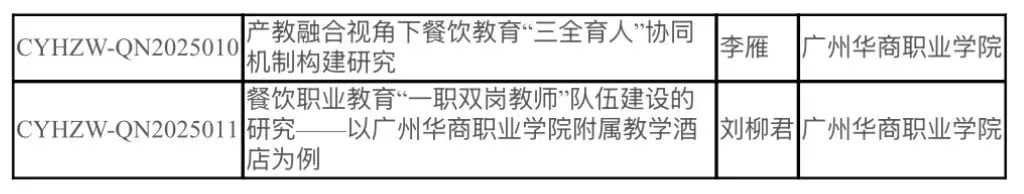 2025年5月15日,广州华商职业学院酒店管理学院何洪健、谢锦权、李雁、刘柳君四位教师申报的课题成功获批立项,其中两项获青年课题立项,两项获一般课题立项,充分展现了我院在餐饮职业教育领域的科研创新能力和教学实践水平。