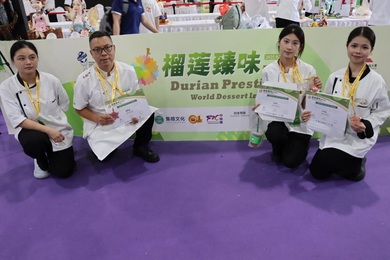 2025年9月27日,第三届亚洲青年艺术烘焙个人挑战赛在广州琶洲展馆圆满落幕。广州华商职业学院酒店管理学院双岗教师崔毅峰老师,与学生陈容怡、陈雨欣在个人赛中凭借精湛技艺与创新作品脱颖而出,均斩获赛事铜奖;学生刘付梅辉获得烘焙组纪念奖,谭雨锋、叶东霖、叶新阳三位同学获雕刻组纪念奖。全体参赛师生在实战中锤炼专业技能,背后离不开学院教师团队的悉心指导与赋能,这既是师生专业技能实力的生动展现,更彰显了学院“岗课赛证融通、以赛促学、以赛促教”的人才培养理念。
