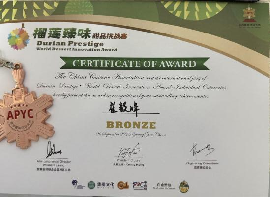备赛期间,教师团队紧扣学院“教学做一体化”核心思路,为参赛师生提供精准支持:双岗教师崔毅峰深耕西式烹饪工艺多年,其作品《悬空榴莲布丁》《榴莲提拉米苏》在口感层次、造型设计与创意表达上突破传统,展现扎实行业功底;同时,学院教师团队围绕学生参赛作品反复打磨细节、优化实操技巧,助力陈容怡、陈雨欣与崔老师同获铜奖,也陪伴刘付梅辉探索烘焙技艺、带领雕刻组同学精进构思与实操,最终收获纪念奖。他们的每一滴汗水都转化为成长的养分