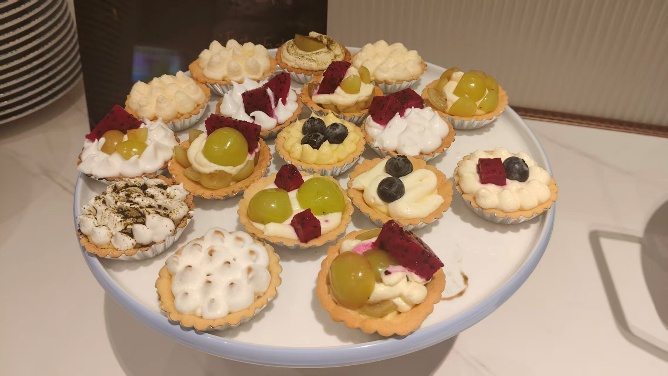 【创新融合类】水果塔——塔皮由企业师傅亲授“黄油香酥配方”,层次分明;内填低脂酸奶慕斯,铺上新鲜草莓、蓝莓等时令水果,顶部撒上糖粉,无添加蔗糖的设计契合健康理念,是弘美餐厅的热门甜品。