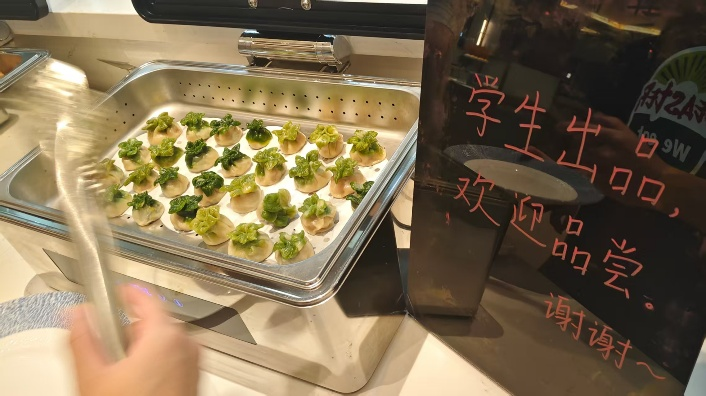【市场落地类】弘美餐厅用餐现场——餐桌上整齐摆放着贴有“校园匠心出品”标识的面点,一位小朋友正拿着猪仔包开心拍照,家长笑着点评:“造型可爱,用料实在,比外面买的更放心,孩子每次来都要点。”