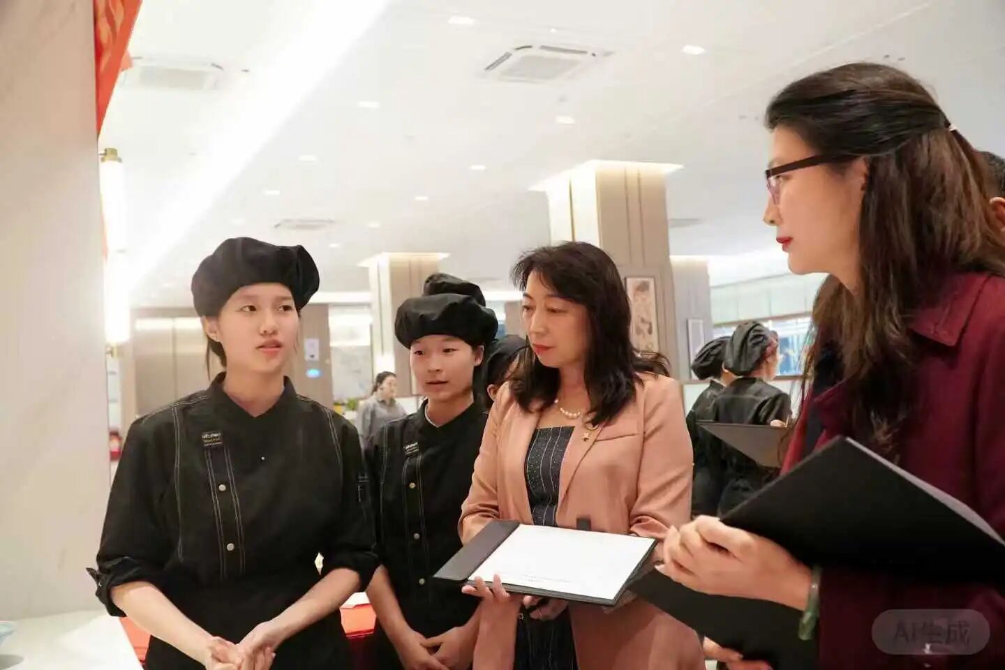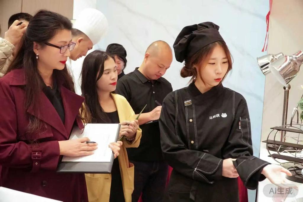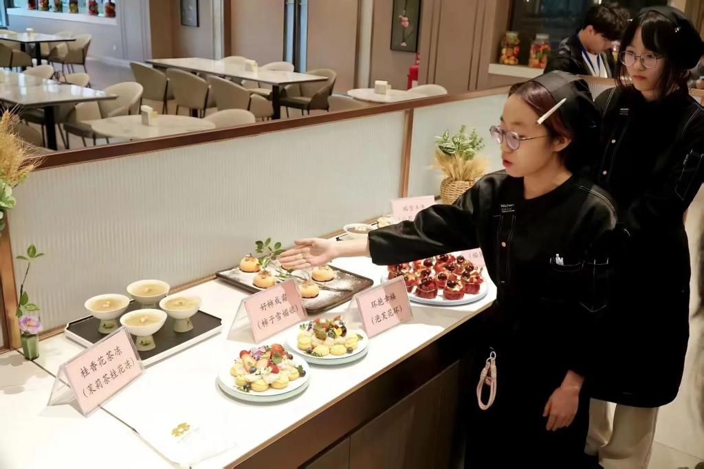 本次作品展邀请全体来宾化身专业评委,开展现场评审打分工作。评审过程中,杨伟传院长、刘玉娟部长等嘉宾严格遵循主题创意、口感风味、造型摆盘、团队协作等多维考评标准,逐一审阅各组作品。评委们不时驻足观察作品细节,认真记录评分要点,严谨细致的评审态度确保考核结果公平公正,也直观检验了“揭榜挂帅”育人模式下的教学成效。