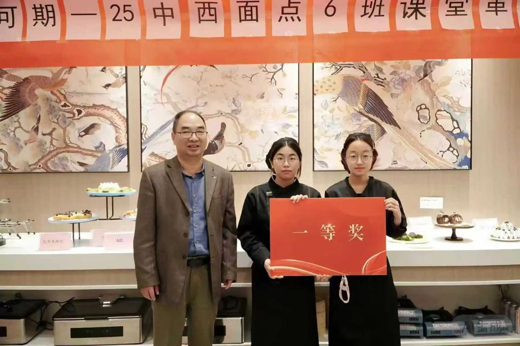 点评环节中,嘉宾们对25面点工艺6班学子的专业素养与创新能力给予高度评价。杨伟传院长称赞道:“同学们的作品兼具基本功底与青春创意,实现传统技艺与现代审美的完美融合,充分彰显‘课堂革命’的育人成效。”经过严格评审,活动最终评选出一等奖1组、二等奖2组、三等奖3组及最受欢迎奖1组。(一等奖联合组长:卢璐;二等奖联合组长:邬丽、余冰慈;三等奖联合组长:劳炫、何金俞、詹嘉祺;最受欢迎奖联合组长:卢璐)现场举行颁奖仪式,嘉宾们为获奖小组颁发荣誉证书及相关奖励,鼓励全体学子深耕面点技艺、传承匠心精神。