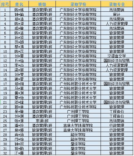 酒店管理学院2020届毕业生一共45人参加专插本升学考试,最终32人被录取,专插本成功率高达71%,创历年新高。以下是被录取名单,在此号召酒店管理学院全体同学,向他们学...